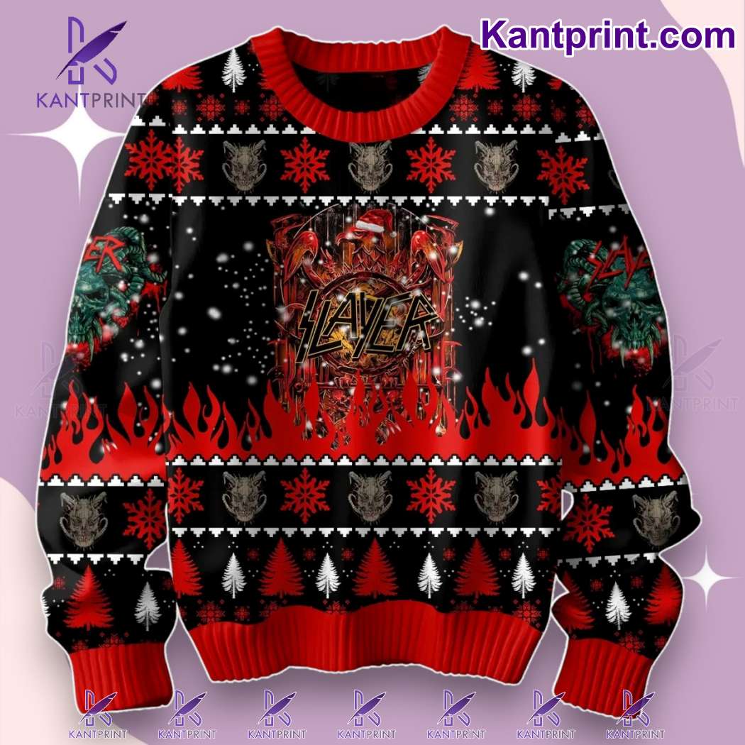 Keywords: Slayer ugly sweater, heavy metal Christmas sweater, Slayer holiday merch, ugly Christmas sweater